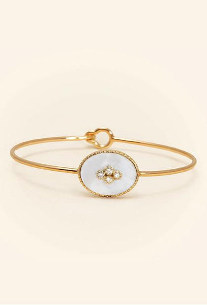 The rose des alizés bracelet is created in our parisian workshop, yellow gold 750% (18 carat). average weight: 7.40 grams. stones: mother of pearl 1 gram on average and 5 diamonds: 0.15 carat (dvs) set by hand in a millegrain mounting.
