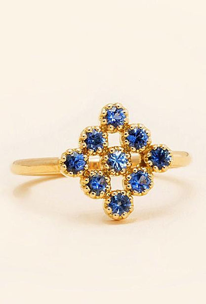 The magic topkapi ring is crafted in our parisian workshop. 18-carat yellow gold. weight: 3,17 grams. stones: 9 sapphires high quality jewelry millegrain mounting: 0,67 carat.