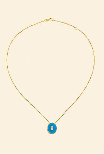 The rose des alizés necklace is created in our parisian workshop, yellow gold 750% (18 carat). average weight: 7,40 grams. stones: turquoise 1 gram on average and 4 diamonds: 0.14 carat (d-vs) set by hand in a millegrain mounting. length of the chain: 42cm.