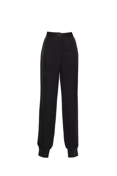 The AFFIRMATION look consists of a bomber, bodysuit and trousers. The bomber is characterised by a short fitted line, its wide dropped shoulders and rounded stand-up collar. The waist is fitted with a wide elastic waistband, typical of bomber jackets. The sleeves are wide and tightened at the wrists. Two piped pockets adorn the bust. The satin bodysuit is ample. It is distinguished by its oversized straight shoulders, its large hood and its long sleeves. The trousers are inspired by the shapes of jogging and dinner jacket trousers. A chic and casual look.