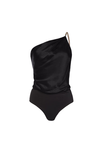The Breathe look consists of a bodysuit and skirt. The satin bodysuit is loose, with a beautiful pleat that starts at the shoulder and disappears down the bust. The back is bare and asymmetrical, supported only by a chain that crosses it. The skirt is long, opening with a slit that reveals a leg from the thigh. A wide belt maintains a delicate fold, which starts on the side and cascades down to the hips and knees.