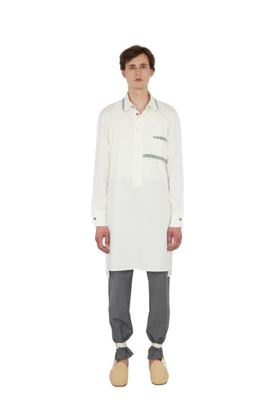 Tunisian placket in front with invisible buttoning Buttoned collar and cuffs