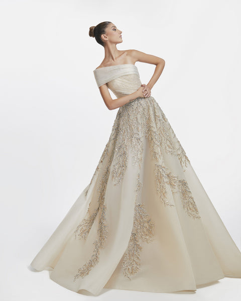 Organza cloqué gold tulle gown.