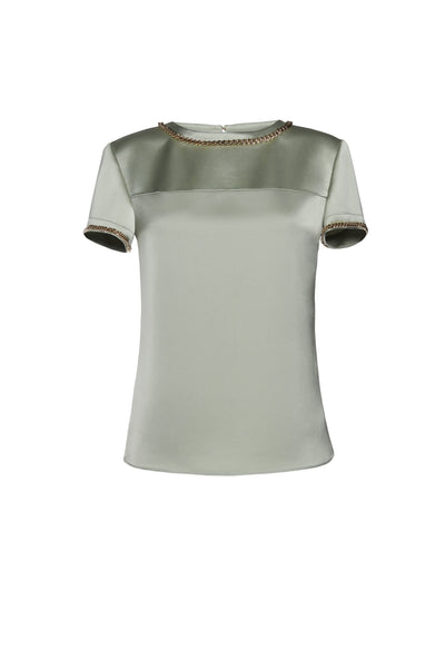 The Emancipation look consists of a top and trousers. The round neckline falls over the collarbones and is accented with a large gold chain. The sleeves are short and tight with thinner chains. The trousers have a wide, straight cut and are high-waisted. The ankles are tightened with gold chains, letting the fabric fall around the ankles.