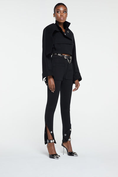 Blouson Crop épaulé, col montant,  à pan asymétrique sur l’épaule, en milano de laine et coton façon ottoman,  fermeture pressions métal argent cousues main et fentes poignets.