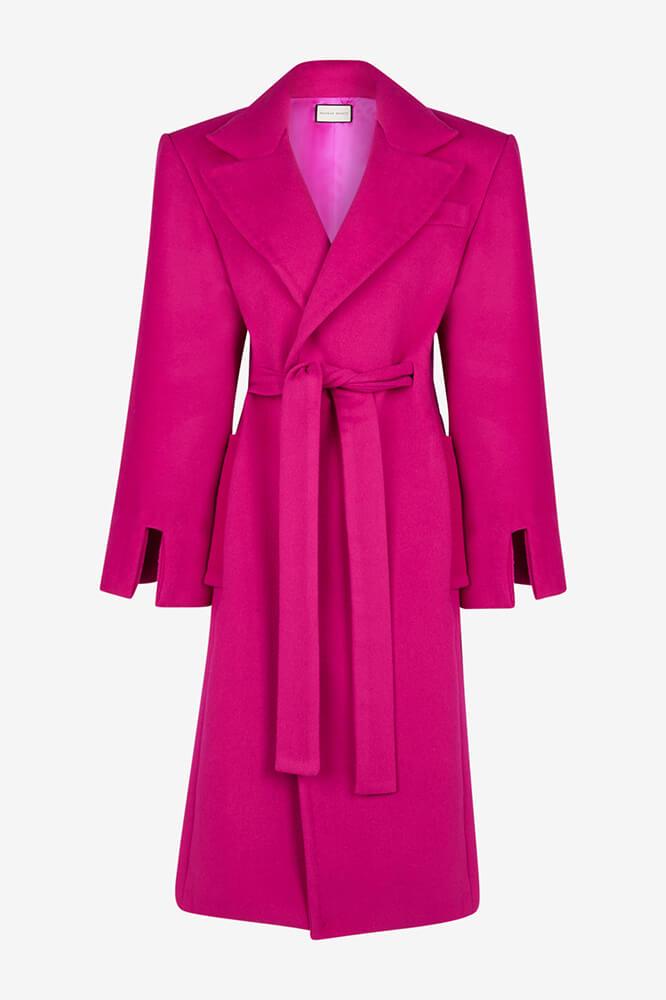 Long double-breasted coat in cashmere and wool, tailored collar, slit sleeves at the back and front, padded back with martingale and tied on the front with an integrated belt. Completely handmade chip stitch finishe.