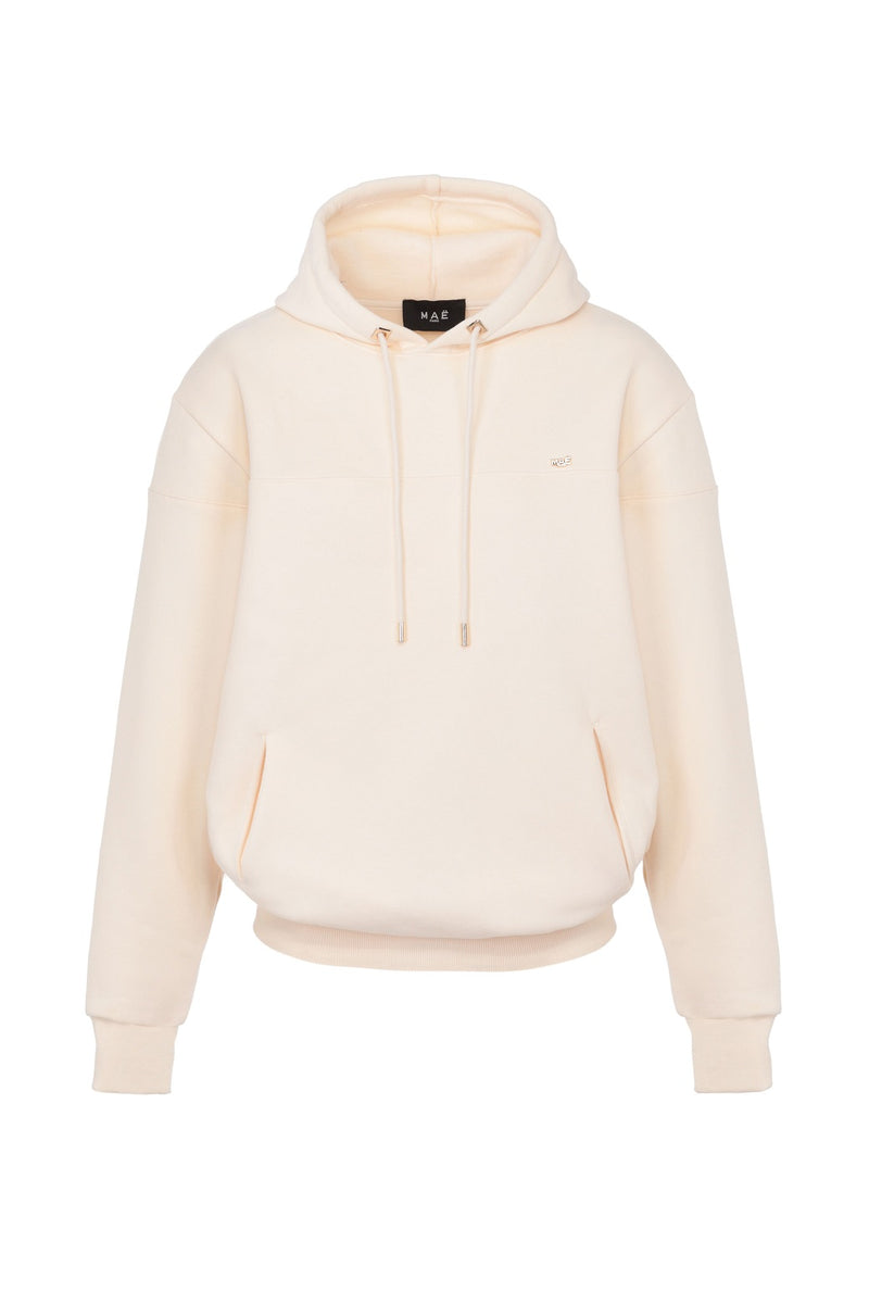 Unisex light beige hoodie in 100% organic cotton. Two pockets on the front.