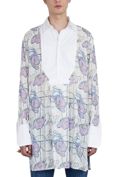 Exceptional cotton canvas shirt Long patterned cotton voile shirt Collar, bib and cuff in white poplin Exclusive flower tartan print motif AW22 / 23 straight cut Rise sleeves Side slit with tightening tab Capuchin tab sleeve with bias printed "VALETTE STUDIO".