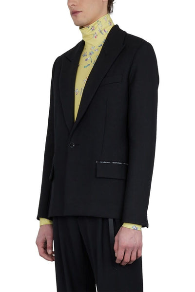 Single-breasted suit jacket in black wool straight cut Double Tailored notched collar Mid back slit Single breasted body 4 buttons on the sleeves Two piped pockets with flap double piping pocket on the left side Two interior welt pockets Buttons engraved "VALETTE STUDIO" Pocket finishes with "VALETTE STUDIO" printed bias Traditional manufacturing