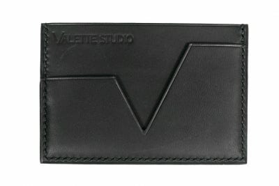 Handmade card case in black vegetable tanned leather Saddle stitching Handmade slice dye Burgundy interior in vegetable tanned leather Graphic V-shaped compartment cut-outs.