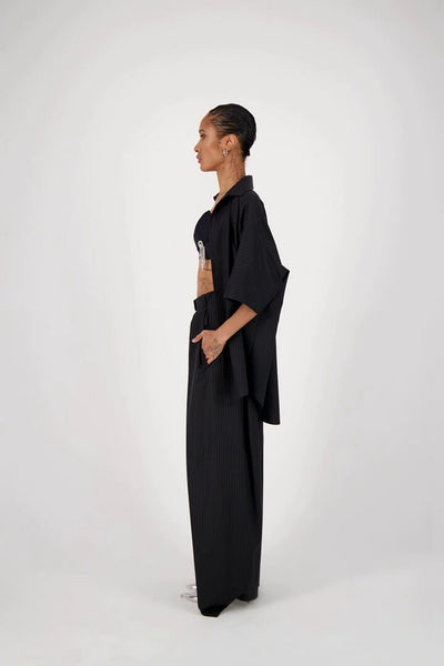 Pantalon large taille haute à plis esprit sarouel et bas découpe pointe, en serge de laine et soie à rayures tennis anthracite et blanc.