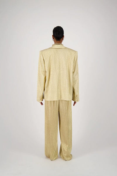 Pantalon large taille haute à plis multiples esprit sarouel et bas découpe pointe, en lamé plissé or pâle.