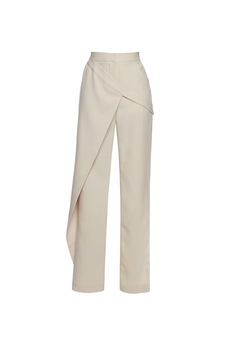 The Redemption look consists of a blouse and trousers. The blouse is pleated from the shoulders to the waist. The collar is round and high, the shoulders are straight and structured. On the sleeves, the fabric folds and turns around the arm before coming to rest on the wrist. The trousers are asymmetrical, with one side falling from the waist to the hip. Cigarette cut, they hug every curve of the hips before widening slightly for more comfort at the knees.