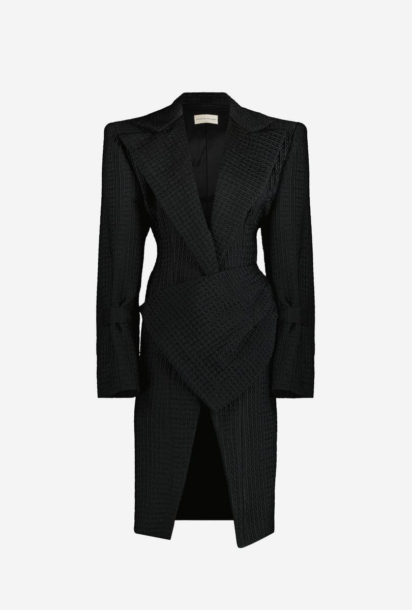 Robe manteau col tailleur V profond, épaulée, en jacquard technique broderie 3D, en soie mélangée