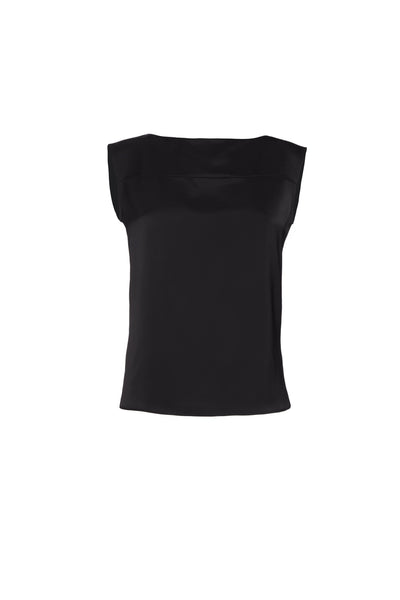 The SOLITUDE look consists of a top and a skirt. The sleeveless top is straight. Its boat neck slightly reveals the collarbones. The skirt is high-waisted and tulip-shaped. It is sculpted in a multitude of pleats, starting from the waist and opening at the knees.
