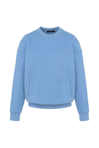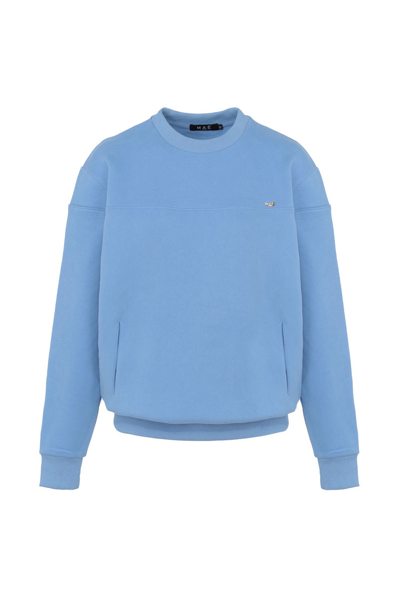 Unisex blue sweatshirt in 100% organic cotton. Two pockets on the front.