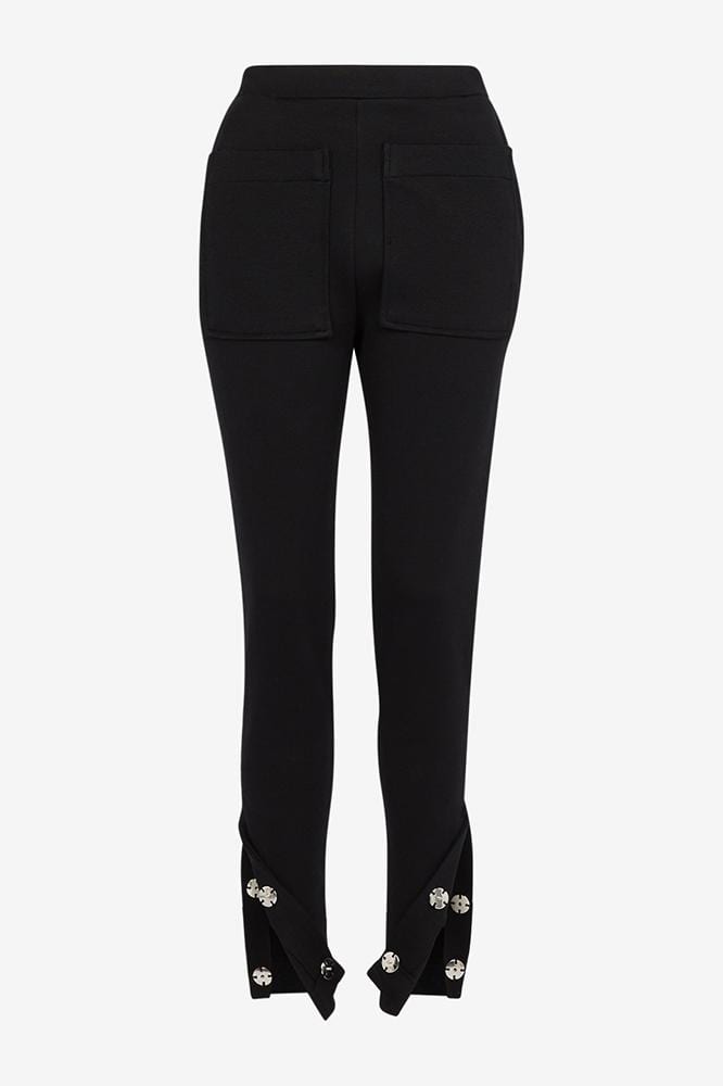 Pantalon tregging seconde peau en milano de laine et coton stretch strié, taille haute élastiquée, poches plaquées devant et dos, fentes côtés fermées avec des pressions en métal argent cousues main